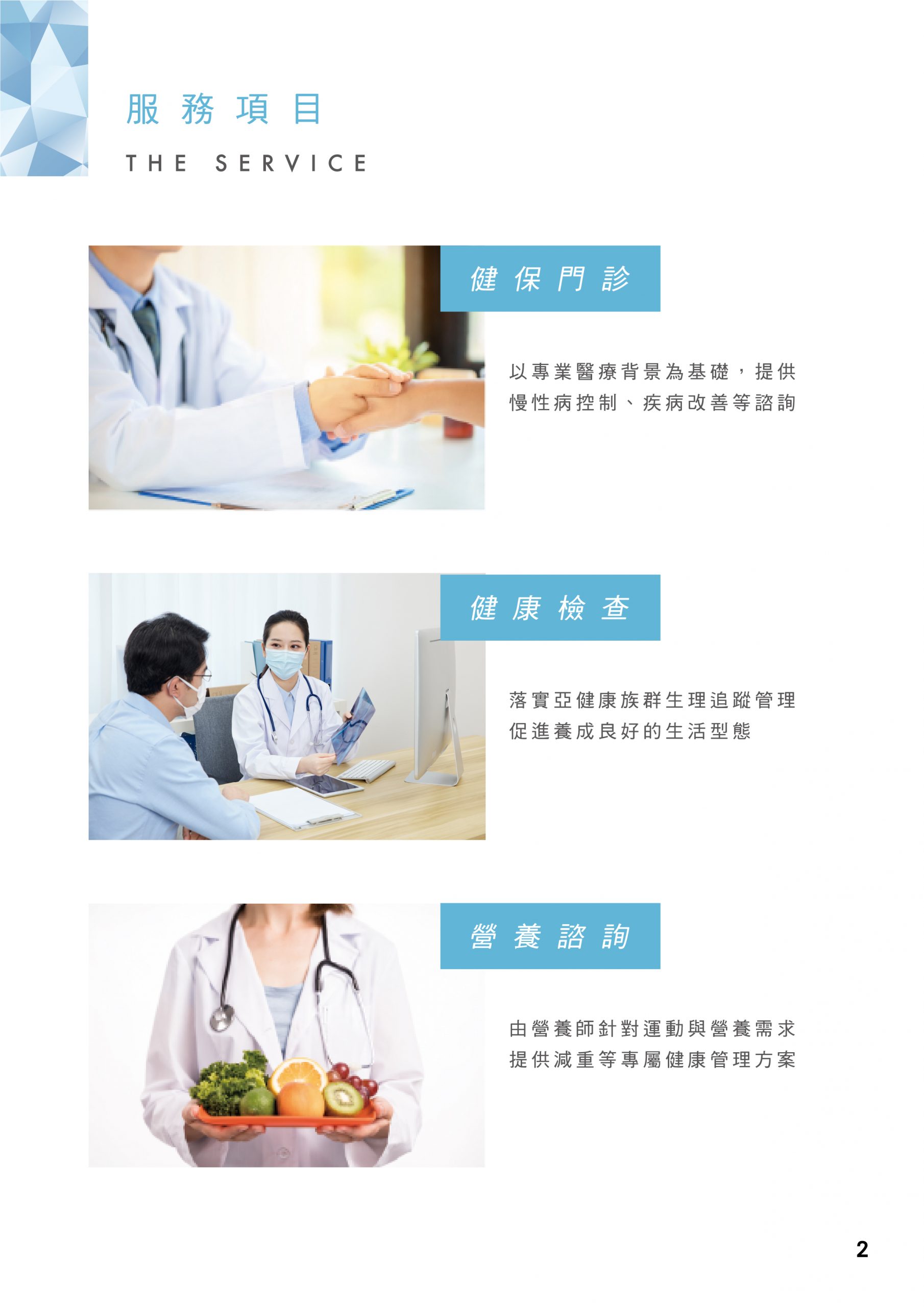 發展感動式服務(落實亞健康族群健康管理,以專業醫療背景為基礎,為受檢者量身打造)。